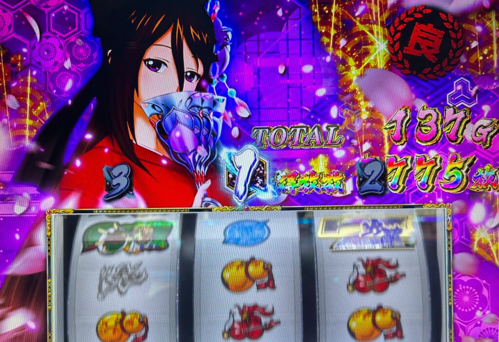 初めのATで伸ばして持ちメダルが多い余裕のある状況からの判別で打っていきまして、ボーナスは軽く、乙女アタックも申し分ない頻度で来ていたので少し早いですが3000G辺りでは高設定を確信できるような内容になっていましたね。