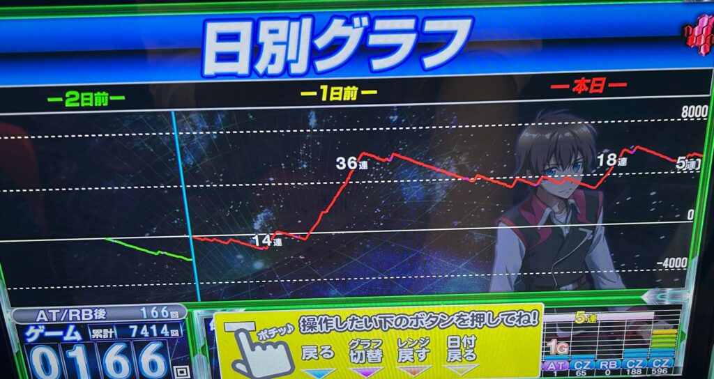 そこからが微妙で決戦1革命1と2回ボーナス取ってAT入れられなかったところから1500ゲーム到達のボナ間天井へ。これだけで3000枚くらい持っていかれました。