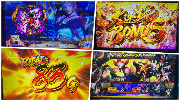 そんな感じで1000枚ほど減らしての1回当たりからの単発後に百竜夜行へ。これをうまいことレア役突破しての大連続ボーナスとってストック4つスタートと大きなチャンスを掴むことに。