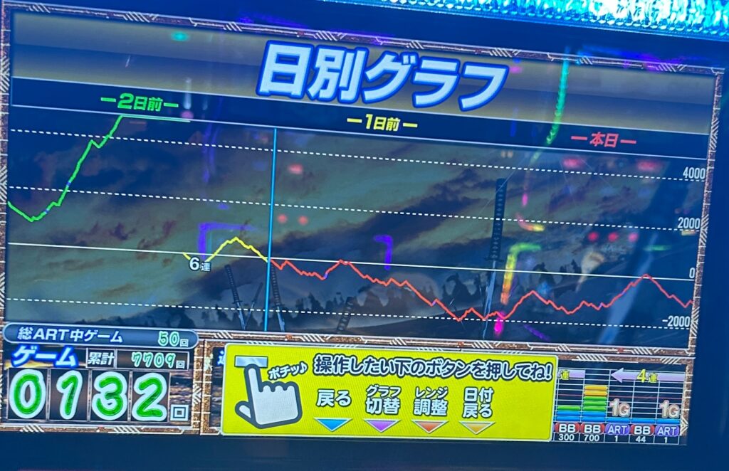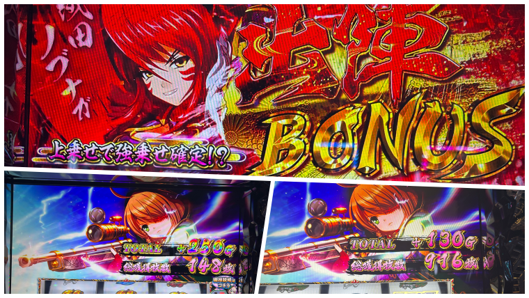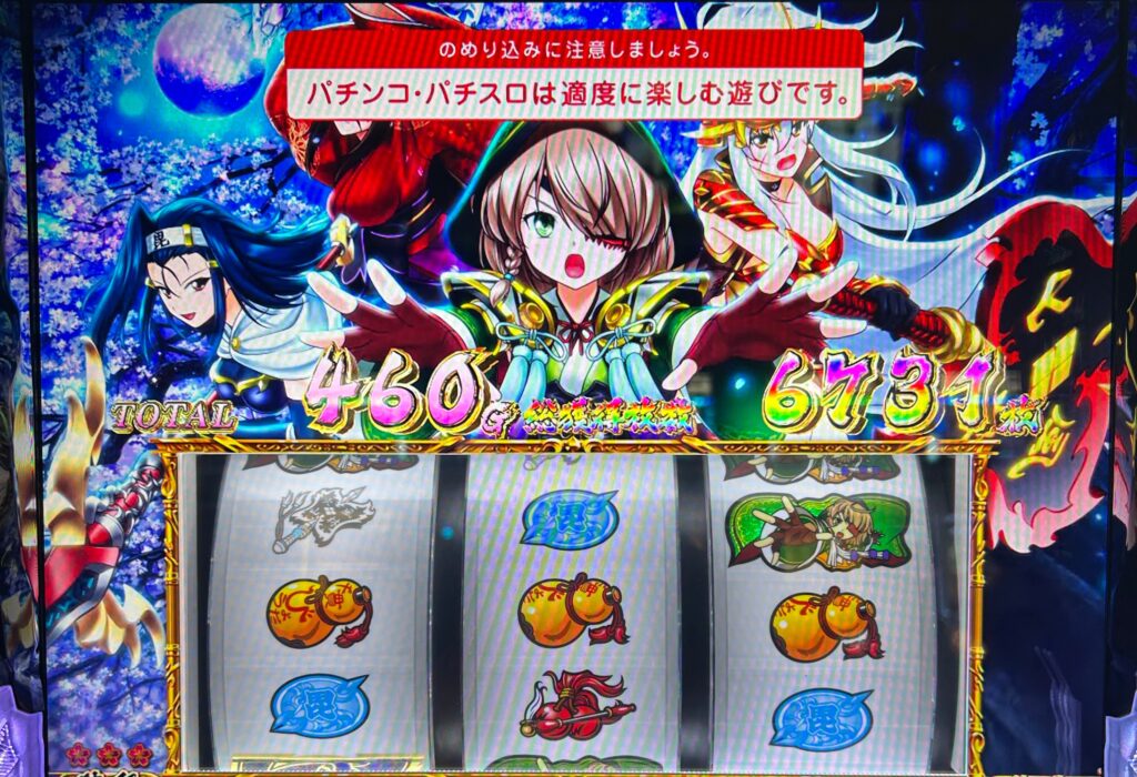 ですが全然噛み合わず、ボーナスからATは5スルーするしATに入れても駆け抜けて終わったりとチャンスを活かせない展開が続き、やっと取った出陣でノブナガやイエヤス、ウジマサでそれなりに乗せた時はボーナスが来ないで抜けてと酷い内容でした。