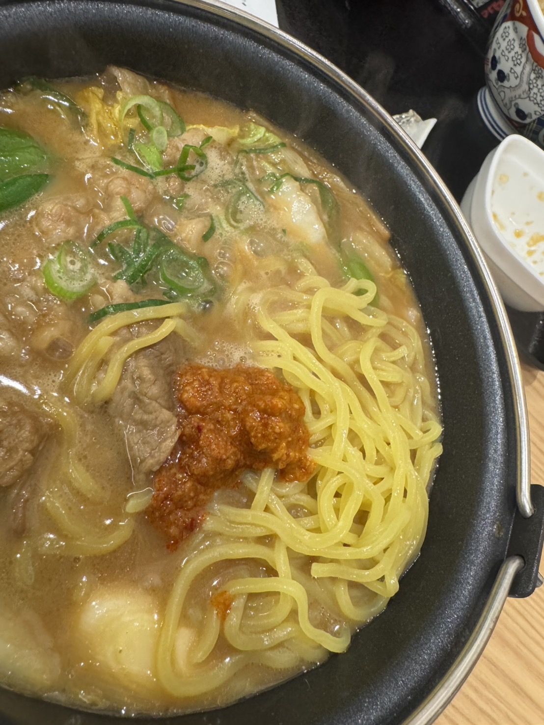 鍋的なものにつけ麺として食すスタイルですね。麺は卵麺だと思います。スープは豚骨の醤油風でした。しっかりと豚骨の味がしてたのでよくできてるなと感心しました。