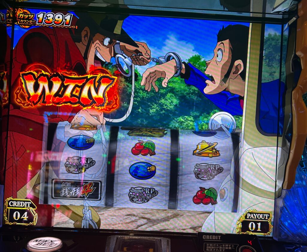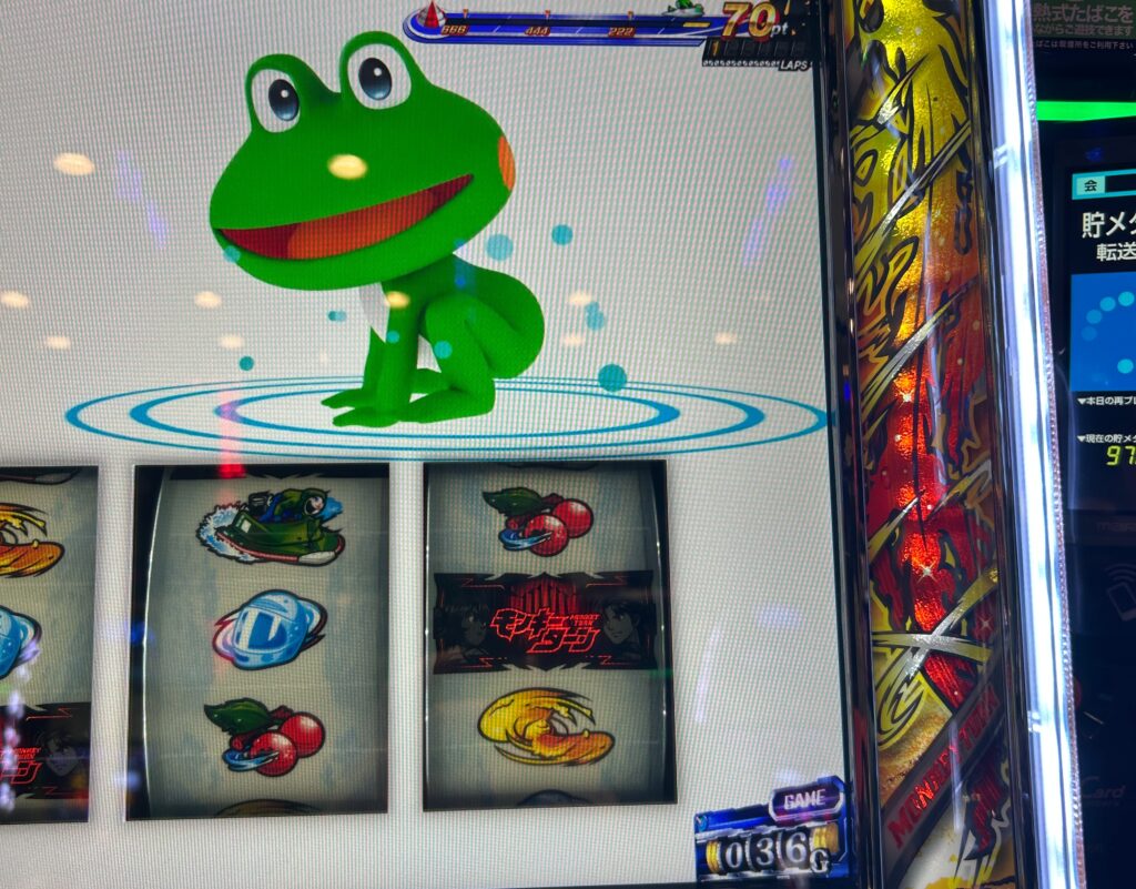 打っていた時からゴージャグにしてもぶどう確率悪いなと思いつつで、うまいことプラマイ0付近までグラフが戻ったので浮逃げしてきました。