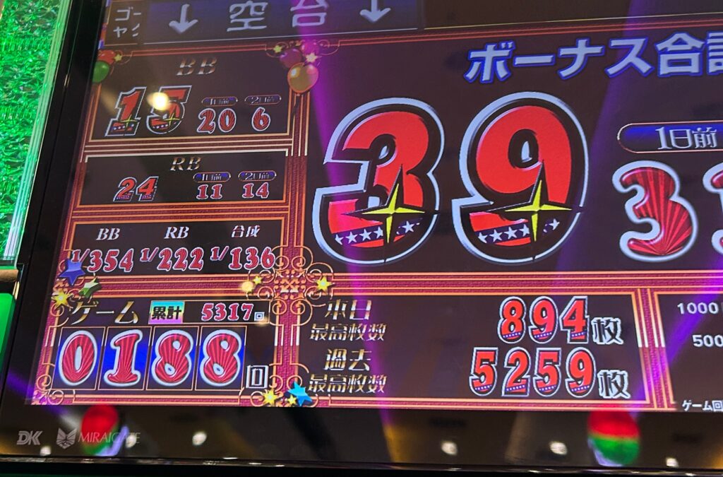 こんな感じの台で、BIGが15のREGが24、5317回転してての合算1/136の台でBIGが引けてない感じの台かなと思って履歴狙いで打ってみました。