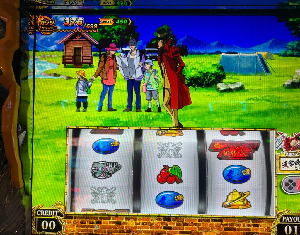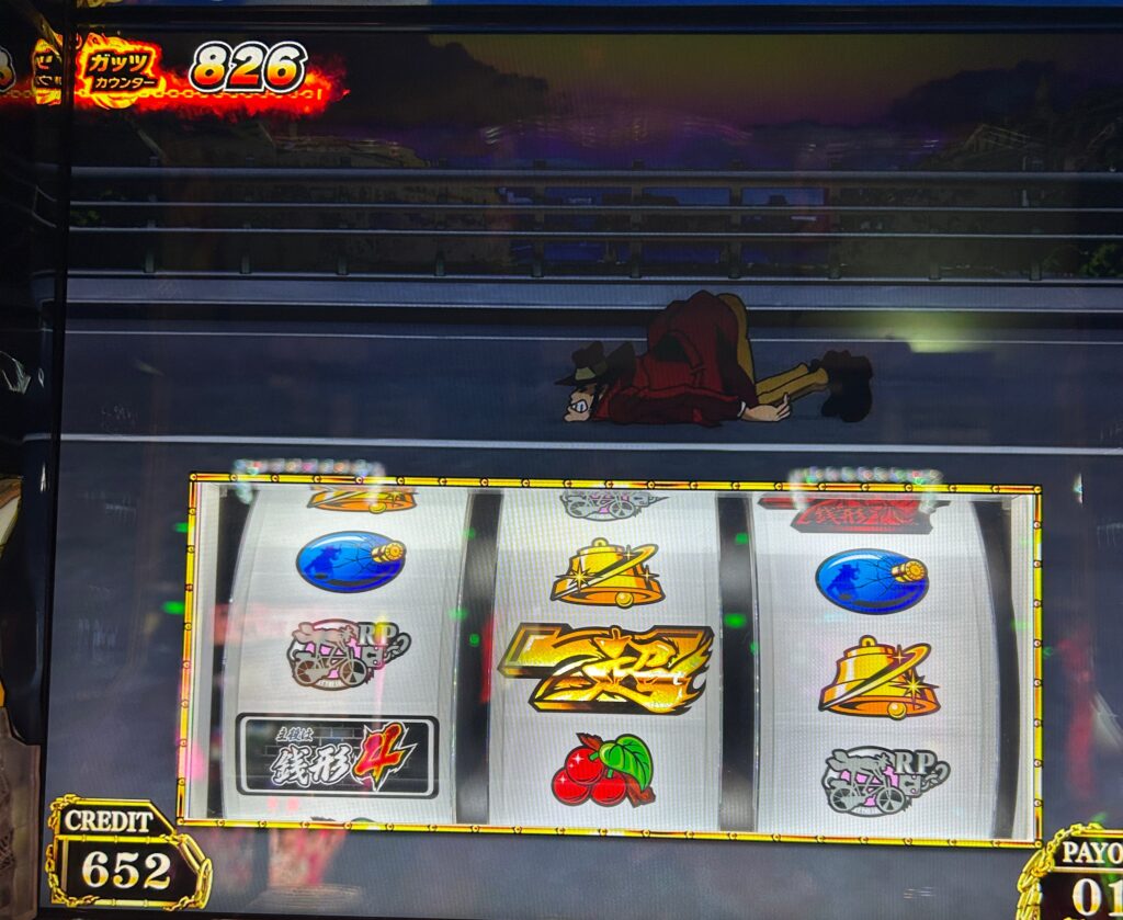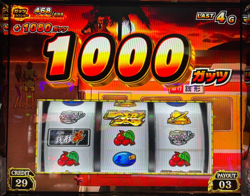 基本的に銭形4の天井は1400ガッツか実ゲーム数1000Gですが、このように分母が出てるパターンがあるのでその時はガッツ天井が短縮されます。今回は699天井に対して376ガッツなので打ってみました。