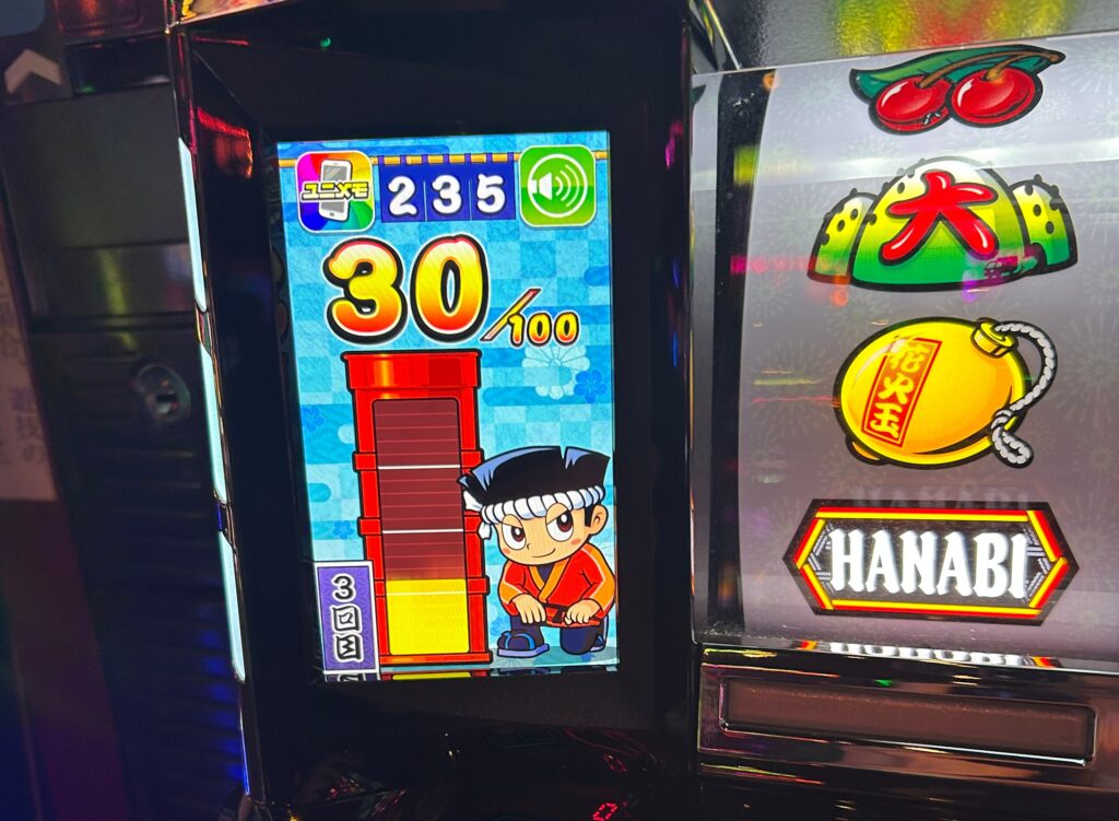 1台目に拾ったのは花火絶景の235ゲーム、3周期30ptの台を拾えました。