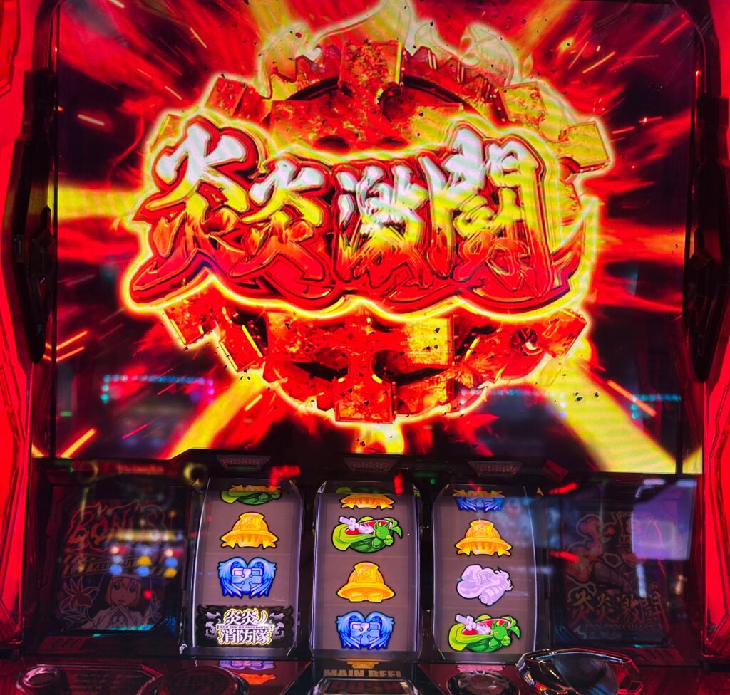 この当たりはやっぱりレギュラーボーナスで、ボーナス後の32ゲーム間におそらくレア役から炎炎激闘を取れました。