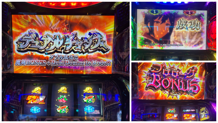 これを打ち初めてすぐの300ゲームのレア役高確のところでレア役を数回引いたところCZ二つが同時に来るデュアルチャンスに入りまして、それを1つ成功のAT当選でした。