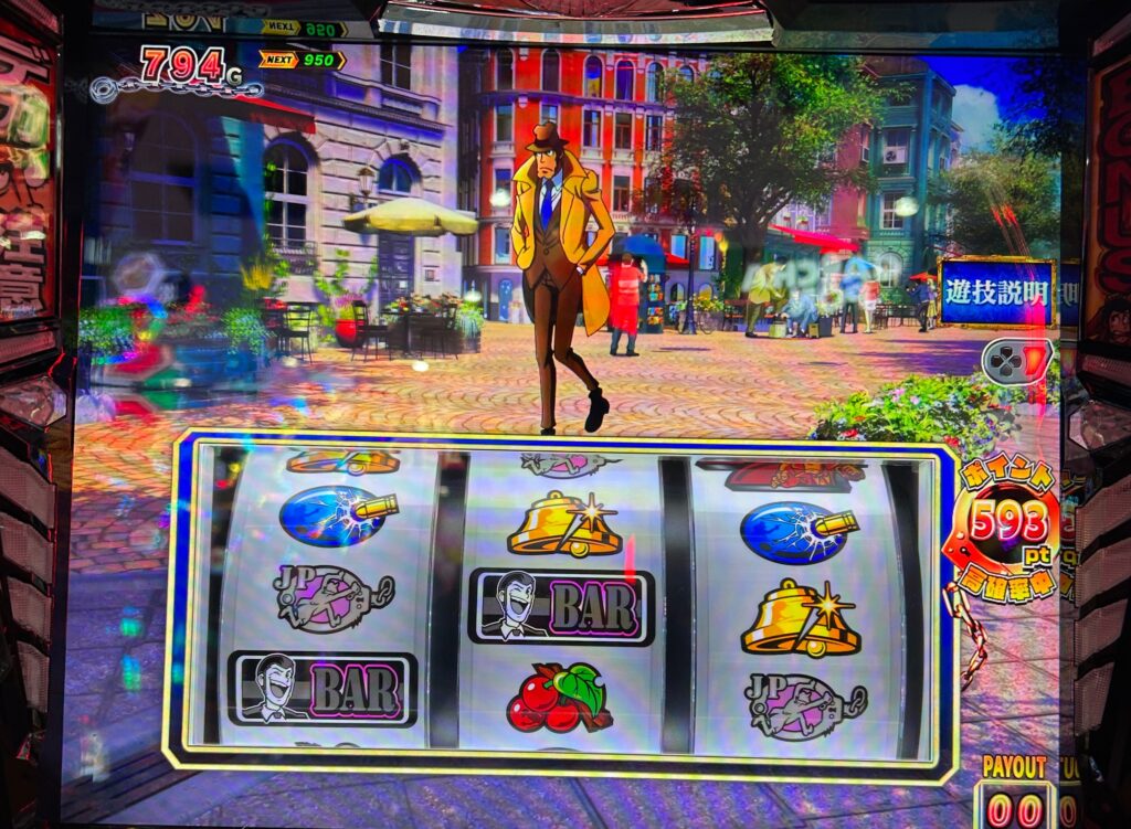 銭形5の天井は1250Gですが、天井恩恵はATに加えて50%で不二子デカタイムスタートと恩恵があるとのこと。ですがモードAでしか1250Gまで行かず、天井ストッパー的な役割の950G天井のモードBがあるみたいですね。どのくらいの割合でモードAが選択されるかは分かりませんがとりあえず今回の794Gなら不問で打てそうなので打ってみました。
