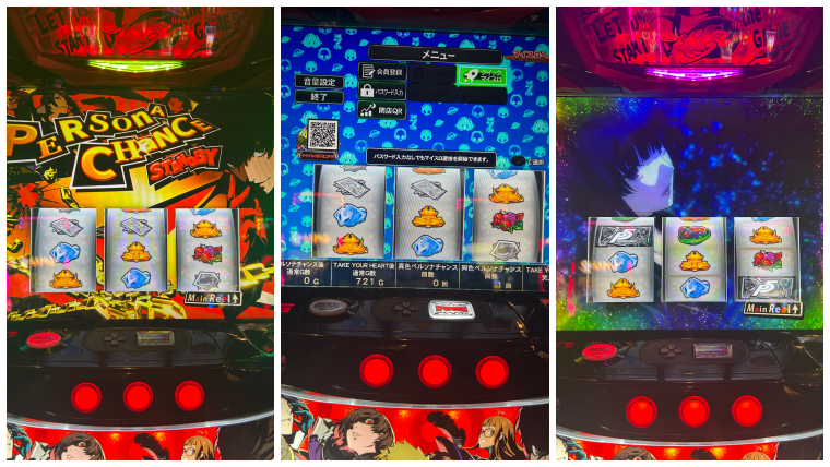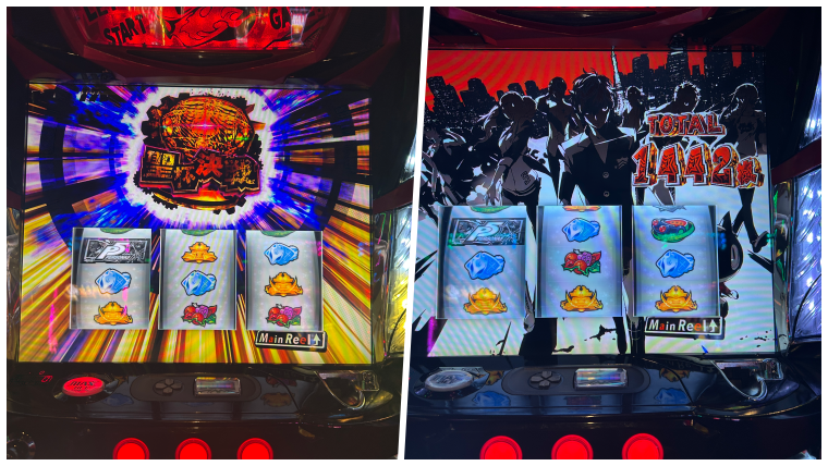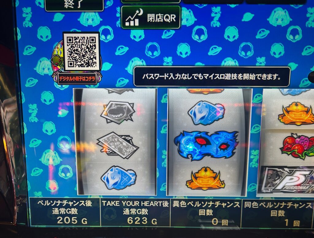 ペルソナは1回ペルソナチャンスを引けているとメニュー画面で据え置き確認できるのが良いところですね。古い台ですがこういう台が拾えるお店は助かります。