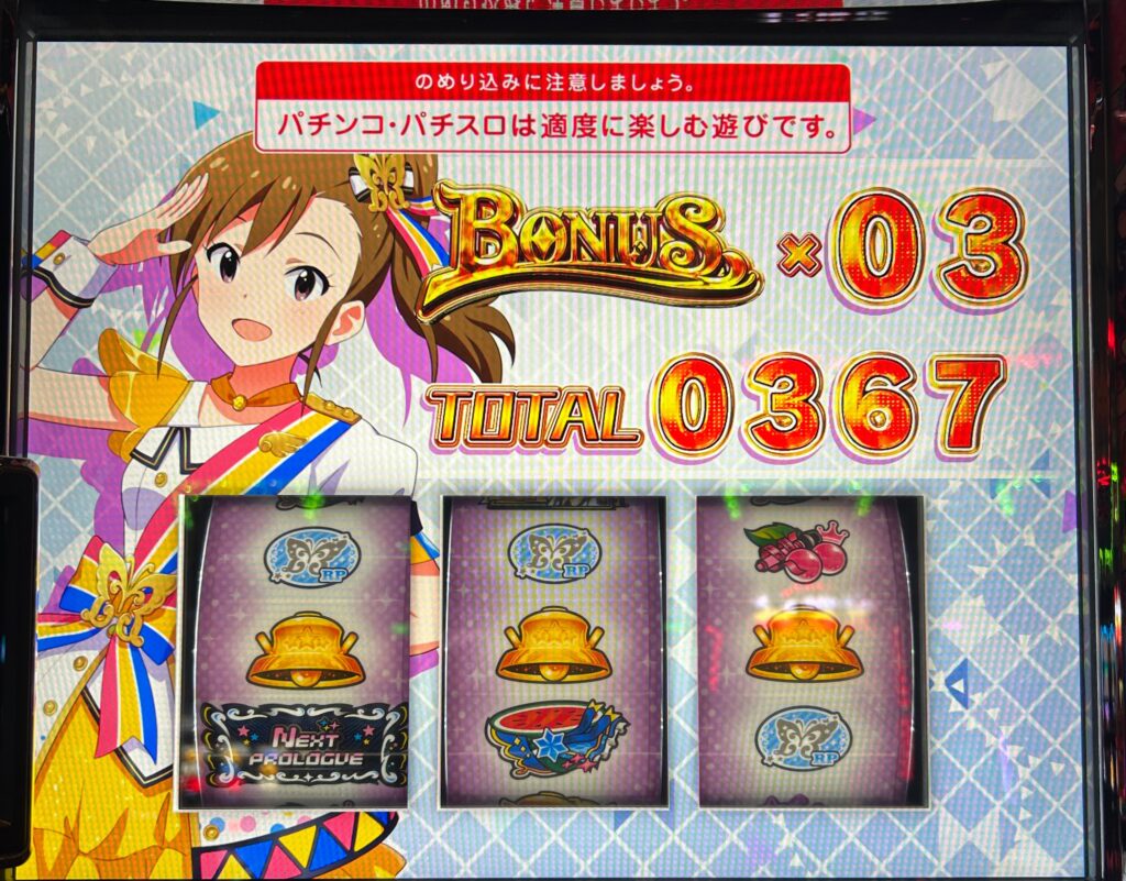 結果は微妙ですがボーナス3個とっての360枚ほどで終了。終了後のボイスはデフォルトで100Gのゾーン確定ではなかったので即辞めして回収は413枚