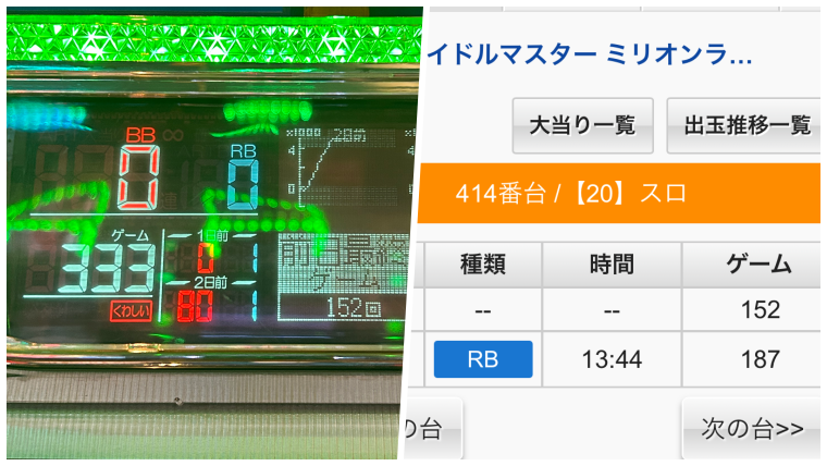 なので当日当たりなし、前日駆け抜け台の333Gならリセでも据え置きでも打てるって感じですね。据え置きなら485Gとめちゃくちゃ美味しいという感じです。